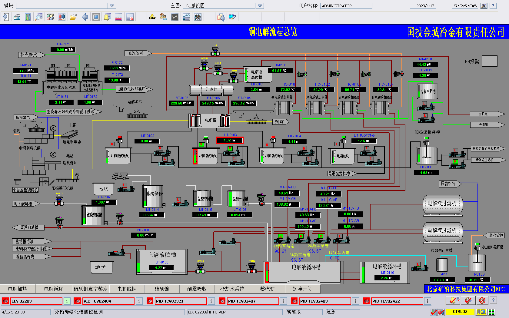 由官方网站总承包的湿法电解区域EPC工程总承包位于河南省灵宝市豫灵镇,生产流程为火法冶炼产出的粗铜,经过电解精炼产出精铜,阳极泥湿法综合回收贵金属。该工程包括电解车间和阳极泥处理车间,两车间相互独立,各设置一套DCS控制系统,均采用冗余控制器+工程师站+操作员站的架构,通过环网联通整个系统。采集的实时生产数据集中归档,并设置一台OPC客户端用于和全厂生产信息管理系统联网,实现全厂资源统一管理。DCS系统针对电解车间电解液加热调节阀频繁,设计带蒸汽压力前馈的PID温度调节,针对添加剂槽蒸汽大,重新设计仪表测量系统,稳定投料速度,减少表面凸瘤和粒子的产生。集成阳极整型机组、天车定位、电解槽短接开关系统、电解液循环过滤系统、阴极剥离机组、残极洗涤机组、真空蒸发机组等子系统,集中显示调配关联数据,方便工艺监控生产过程。