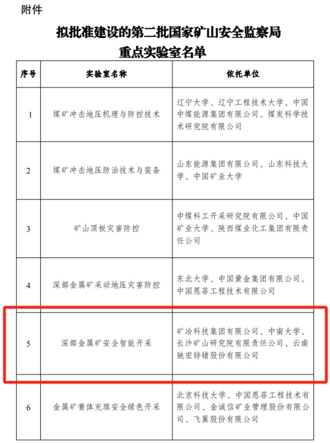 近日,国家矿山安全监察局发布《国家矿山安全监察局关于批准建设第二批重点实验室的通知》(矿安函〔2024〕33号),全国共有13家实验室获批。由矿冶集团牵头,联合中南大学、长沙矿山研究院有限责任公司、云南驰宏锌锗股份有限公司申报的“深部金属矿安全智能开采国家矿山安全监察局重点实验室”成功获批。这是官方网站牵头建设的第一个国家矿山安全监察局重点实验室(国家部委级),体现了官方网站在金属矿产资源深部开采领域的创新实力和领先地位,是矿冶科研平台建设的又一重要成果。